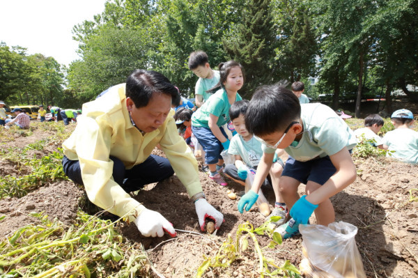 서울 구로구는 10일 안양천 둔치에 위치한 어린이 자연학습장에서 지역내 유치원생들이 참여한 가운데 '감자 캐기 행사'를 개최했다. 이날 수확된 감자는 어려운 이웃들에게 전달된다. 사진은 이성 구청장(왼쪽)과 어린이가 감자를 캐는 모습. (사진제공=구로구청)