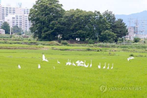 11일 오전 경북 경주시 안강읍 논에 백로가 모여 앉아 있다.