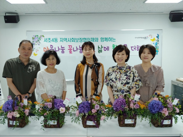 최근 서울 서초구 서초4동이 직접 제작한 꽃바구니를 지역내 저소득 홀몸노인과 주거취약가구에 전달하는 ‘마음나눔 꽃나눔 행사’를 개최했다. 사진은 전달할 꽃바구니를 제작하고 있는 지역사회보장협의체 위원들의 모습. (사진제공=서초구청)