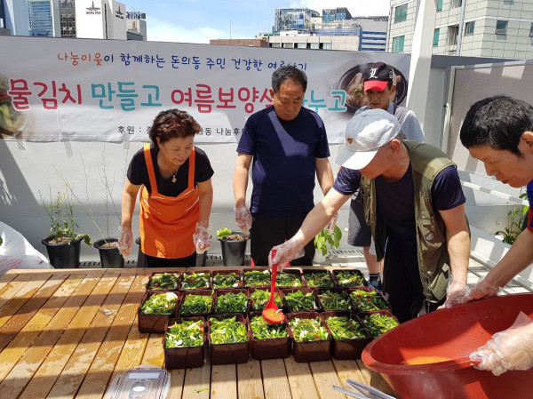 지난 9일 종로1·2·3·4가동은 돈의동쪽방상담소에서 나눔이웃, 효행본부, 지역사회보장협의체와 함께 '물김치 만들고, 여름보양식 나누고' 를 진행했다. 이날 행사에서 만든 물김치와 ‘나눔후원회’에서 후원한 삼계탕·전복죽 등의 여름철 보양식 꾸러미는 지역내 홀몸노인 20가구에 전달됐다.(사진제공=종로구청)