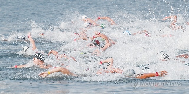 14일 여수 엑스포 해양공원 오픈워터 수영 경기장에서 열린 오픈워터수영 여자 10km 경기에서 임다연(검은색 모자)이 역영하고 있다.