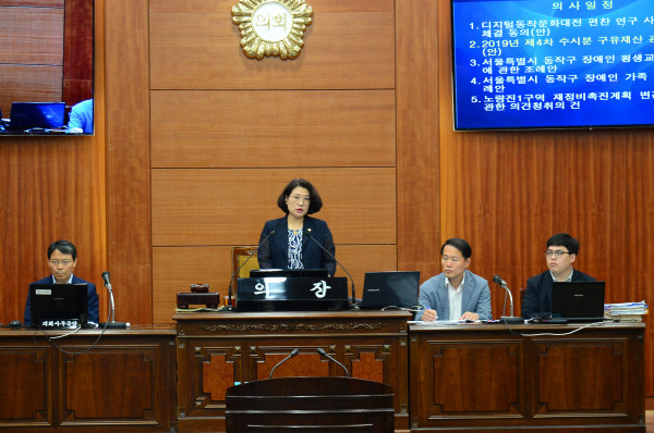 이날 처리한 안건은 총 5건으로 행정재무위원회(위원장 전갑봉)에서는 ▲'디지털동작문화대전' 편찬 연구 사업 협약체결 동의(안) ▲ 2019년 제4차 수시분 구유재산 관리계획(안) 2건을, 복지건설위원회(위원장 신희근)에서는 ▲ 서울특별시 동작구 장애인 평생교육 지원에 관한 조례안(이미연 의원 대표발의) ▲ 서울특별시 동작구 장애인 가족 지원 조례안(조진희 의원 대표발의) ▲노량진재정비촉진계획(노량진1구역) 변경 결정(안)에 관한 의견청취의 건 3건을 심의·의결했다.