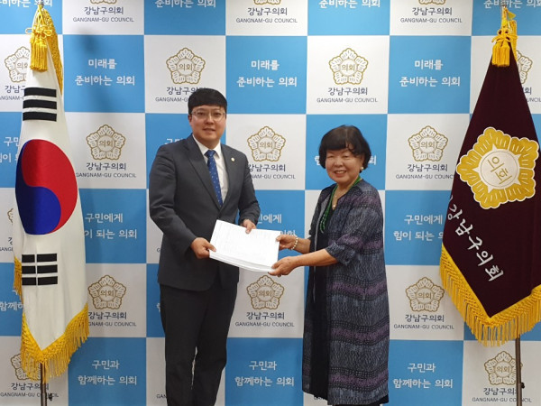 이관수 서울 강남구의회 의장이 최근 구의회를 방문한 ‘세곡동 대형 셀프세차장 건립 반대 추진위원회’로부터 세곡동 내 24시간 대형 셀프세차장 폐쇄를 요구하는 내용의 주민 서명부를 접수했다. 사진은 서명부를 접수 받은 이의장(왼쪽) 김길자 주민대표가 서명부를 전달하고 있는 모습.(사진제공=강남구의회)