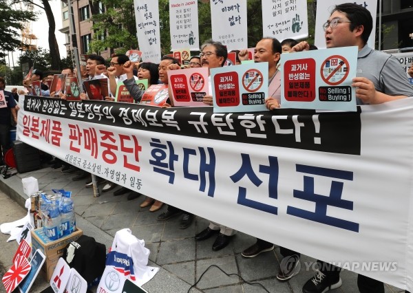 한국중소상인자영업자총연합회 회원들이 15일 서울 종로구 옛 주한 일본대사관 앞에서 '일본제품 판매중단 확대선포 기자회견'을 열고 일본의 수출규제를 규탄하는 구호를 외치고 있다. 이들은 담배 및 주류 위주로 판매중단 운동을 벌이다 지난 13일부터 음료, 조미료 및 소스류 등으로 범위를 확대했다고 밝혔다.