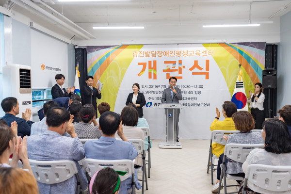 서울 광진구는 학령기 이후 성인 발달장애인에게 맞춤형 평생학습을 지원하고 자립·자활 기반을 조성하고자 15일 광진발달장애인 평생교육센터를 개관했다. 사진은 개관식에 참석한 김선갑 구청장이 인사말을 하고 있는 모습. (사진제공=광진구청)
