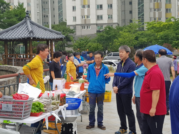 경기 김포시 농업기술센터 소장이 최근 운양동 모담폭포에서 열리고 있는 김포농업인 새벽시장을 방문했다. 이날 센터 소장은 생산자와 소비자가 상생할 수 있는 농산물 직거래 장터 조성을 당부했다. 사진은 농업인들과 이야기를 나누는 모습. (사진제공=김포시청)