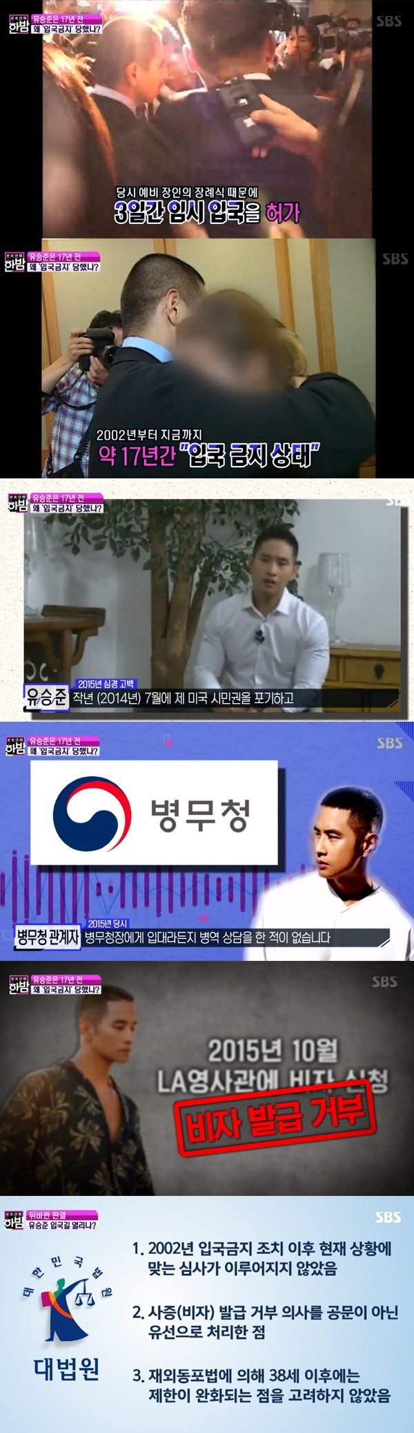 16일 방송된 SBS '본격 한밤 연예'에서는 유승준에 대해 다뤘다. 유승준은 지난 2002년 병역 기피 논란으로 17년 동안 한국땅을 밟지 못했다. 그러나 대법원은 유승준에게 비자 발급 거부 행정절차가 위법하다고 판단해 원심을 파기, 이에 유승준의 입국 가능성이 높아졌다.