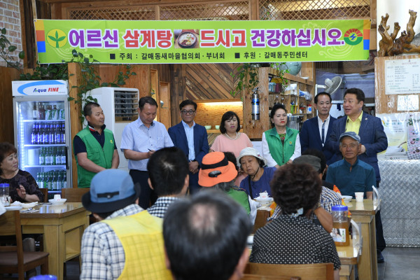 경기 구리시 갈매동은 17일 중복을 앞두고 새마을부녀회와 새마을협의회 주관으로 홀몸노인을 위한 경로잔치를 개최했다. 이날 지역내 저소득 홀몸노인 60명을 초청해 직접 준비한 삼계탕을 대접했다. 사진은 안승남 시장이 인사말을 하는 모습. (사진제공=구리시청)