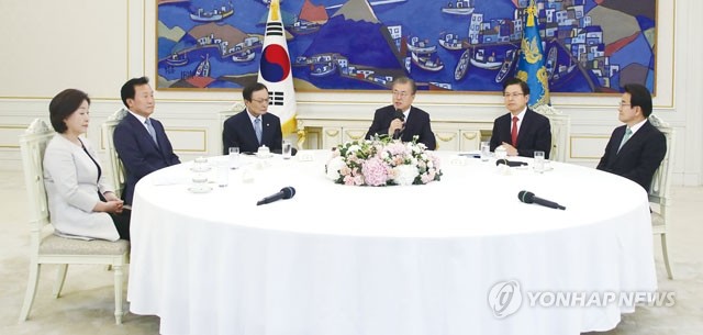 문재인 대통령이 18일 오후 청와대에서 열린 '정당대표 초청 대화'에서 여야 5당 대표들과 얘기를 나누고 있다. 왼쪽부터 정의당 심상정 대표, 바른미래당 손학규 대표, 더불어민주당 이해찬 대표, 문 대통령, 자유한국당 황교안 대표, 민주평화당 정동영 대표.
