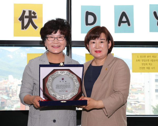 | ▲ 감사패를 받은 유인애 부의장(왼쪽)이 관계자와 기념촬영을 하고 있다. (사진제공=강북구의회) | ||