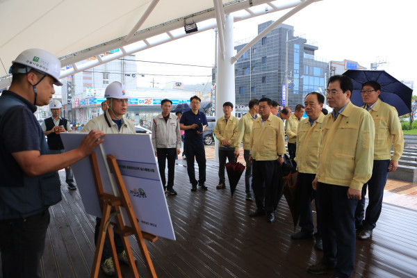 신우철 전남 완도군수가 제5호 태풍 '다나스'가 북상함에 따라 19일 비상대책 회의를 한 후, 지역내 재난 취약지역 현장점검에 나섰다. 사진은 지역 인근 대형공사장을 찾은 신 군수(오른쪽)가 관계자로부터 현장상황을 듣고 있는 모습. (사진제공=완도군청)