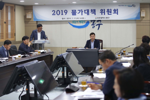 인천 동구는 최근 구청 상황실에서 '물가대책위원회'를 개최했다. 이날 회의에서는 주민부담을 최소화하기 위해 지역내 하수 청소 수수료의 70% 수준까지 인상하기로 심의 의결했다. 사진은 허인환 구청장이 회의를 주재하고 있는 모습. (사진제공=동구청)