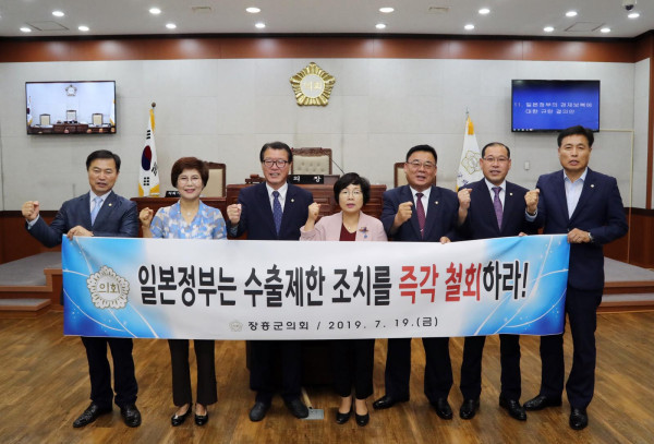 | ▲ 장흥군의회가 최근 열린 제248회 임시회 제2차 본회의에서 만장일치로 ‘일본의 경제보복에 대한 규탄 결의안’을 채택했다. 사진은 규탄결의안 채택 후 항의 플래카드를 들고 수출제한 조치 철회를 외치고 있는 군의원들의 모습. (사진제공=장흥군의회) | ||