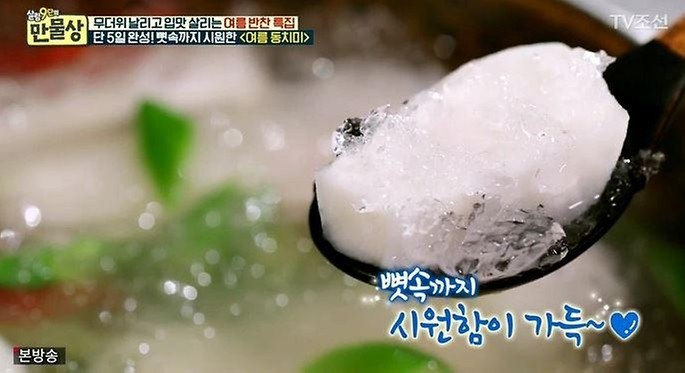 그는 “여름 동치미에 총각무를 사용하면 여름 내내 무리지 않고 오랫동안 동치미를 먹을 수 있다”며 “맛술, 액젓, 꽃소금 등을 넣은 총각무를 하루 정도 숙성한 뒤 사골곰탕 2컵을 넣어주면 시원하고 깊은 맛이 나는 여름 동치미가 된다”고 설명했다.