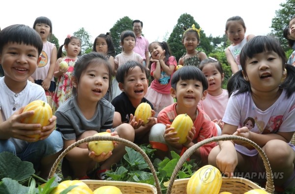 22일 오전 서울 용산구청 앞마당에서 열린 '꼬마 농부와 함께하는 용산 마을농원 향토 작물 수확 행사'에서 지역내 어린이집 아이들이 참외를 따서 보여주고 있다.