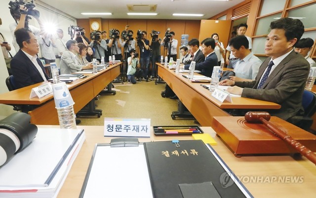 이정규 경희고등학교 교장(앞줄 오른쪽) 등 경희고 관계자들이 22일 오전 서울 종로구 서울시교육청 학교보건진흥원에서 열린 재지정 탈락 자율형 사립고 청문회에 참석해 청문주재자 참석을 기다리고 있다.
