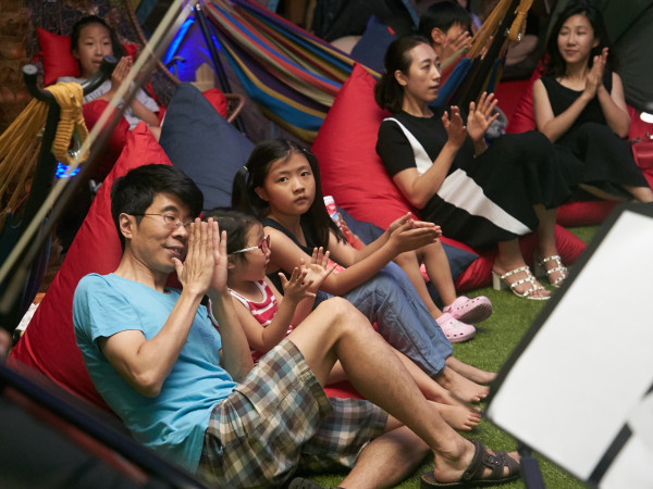 서울 서초구가 최근 구청 대강당과 서초·양재·내곡 느티나무쉼터내 가족캠핑형 폭염대피소를 설치했다. 사진은 구청 폭염대피소를 방문한 가족들이 빈백소파에 기대 음악콘서트를 감상하고 있는 모습. (사진제공=서초구청)