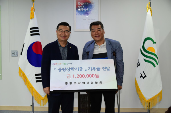 류경기 서울 중랑구청장은 22일 오후 3시 구청장실에서 중랑구장애인연합회로부터 중랑장학기금 120만원을 전달받았다. 사진은 류 구청장(왼쪽)과 양태경 중랑구장애인연합회 회장이 기념촬영을 하는 모습. (사진제공=중랑구청)
