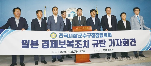 전국시장군수구청장협의회 공동회장단과 더불어민주당 김두관 참좋은지방정부위원회 상임위원장이 23일 오전 국회 정론관에서 일본 경제보복 조치 규탄 기자회견을 하고 있다. 이들은 성명문에서 “일본의 수출규제가 철회될 때까지 공무수행을 위한 일본 방문을 중단할 것을 천명한다”고 말했다.