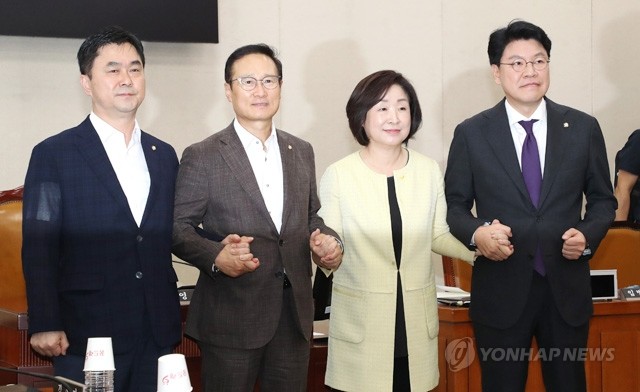 더불어민주당 소속 신임 정치개혁특별위원회 홍영표 위원장(왼쪽 두번째)과 정의당 심상정 전 위원장 등 간사들이 23일 오전 국회에서 열린 전체회의에서 기념촬영을 하고 있다. 왼쪽부터 더불어민주당 김종민 간사, 홍영표 위원장, 정의당 심상정 전 위원장, 자유한국당 장제원 간사.