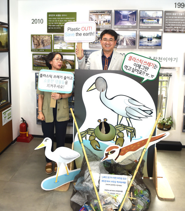 오승록 서울 노원구청장은 23일 중랑천환경센터에서 열린 하천생태계보존 및 쓰레기문제 기획특별전시 체험전에 참석했다. 전시는 오는 31일까지 열린다. 사진은 오 구청장(오른쪽)과 관계자가 플라스틱 근절 푯말을 들고 있는 모습. (사진제공=노원구청)