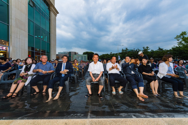 광진구가 무더운 여름밤에 물에 발을 담그고 시원한 음료를 마시면서 편하게 즐길 수 있는 음악축제를 선보였다. 구는 23일 오후 7~9시 세종대학교 대양AI센터 거울 연못에서 ‘군자동과 세종대가 함께하는 한여름 밤의 음악축제’를 개최했다. 사진은 축제를 즐기고 있는 김선갑 구청장(가운데)의 모습. (사진제공=광진구청)