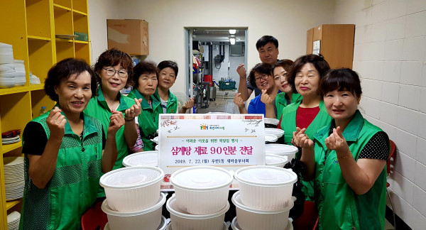 경기 수원시 팔달구 우만1동에서는 지난 22일 건강한 여름나기를 기원하고자 ‘사랑의 복달임’ 행사를 가졌다. 이날 새마을부녀회 회원들은 이른 아침부터 부지런히 준비한 삼계탕을 지역내 노인 90명에게 전달했다. 사진은 행사에 참여한 관계자들이 기념촬영을 하는 모습. (사진제공=수원시청)