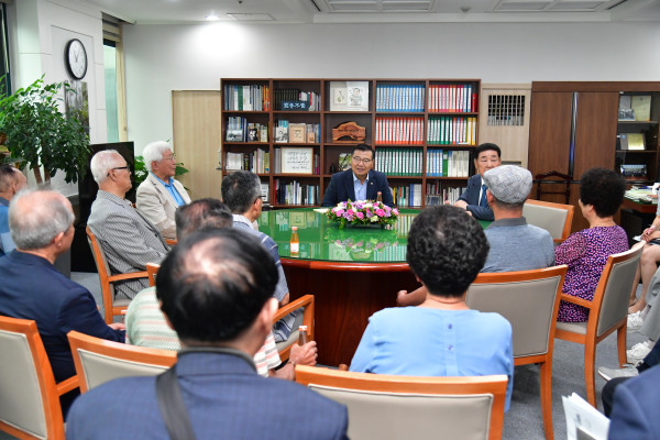 서울 중랑구는 지난 23일 경로당 회장단 22명을 구청으로 초청해 민선7기 1주년 기념 ‘경로당 회장단 정책 공유 간담회’를 개최했다. 사진은 간담회에 참여한 류경기 구청장(가운데)이 경로당 회장단과 이야기를 나누고 있는 모습. (사진제공=중랑구청)