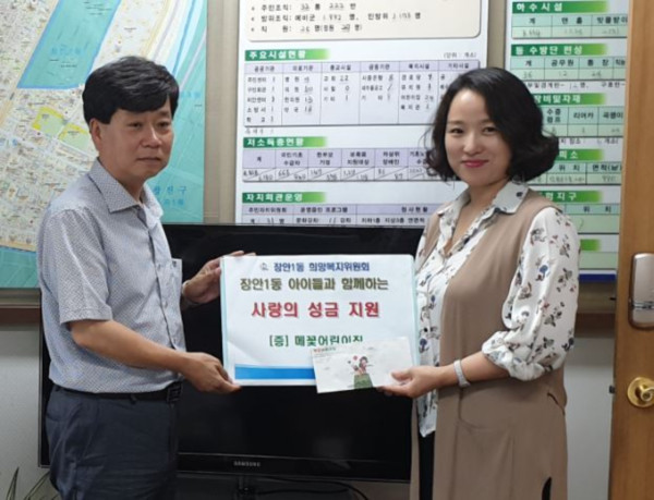 최근 서울 동대문구 장안1동에 위치한 메꽃어린이집의 김현정 원장이 장안1동 동주민센터에 ‘아나바다 시장놀이 바자회 행사’에서 얻은 수익금 50만원을 어려운 이웃을 위해 기탁했다. 사진은 성금 기탁 후 기념촬영을 하고 있는 김 원장(오른쪽)의 모습. (사진제공=동대문구청)