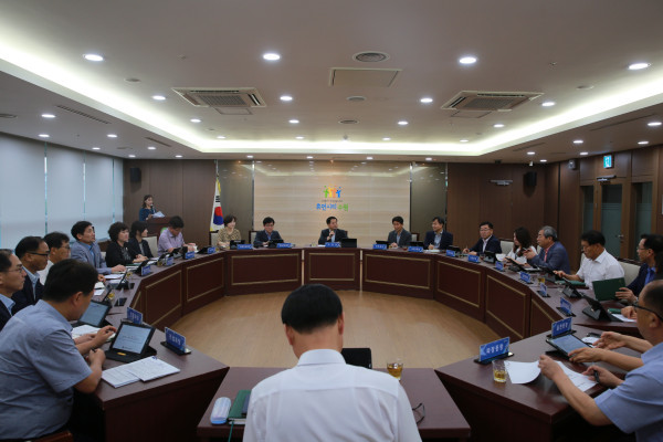경기 수원시 장안구는 24일 구청 3층 상황실에서 8월 구 월간업무보고회를 개최했다. 이날 보고회는 이병규 장안구청장 취임에 따른 첫 월간업무보고로 이 구청장은 부서별 현안사항과 주요업무계획에 대해 보고받았다. 사진은 이 구청장이 구청 직원들과 이야기를 나누는 모습. (사진제공=장안구청)