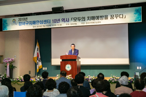서울 강서구는 25일 이대서울병원 지하 2층 대강당에서 ‘모두의 치매예방을 꿈꾸다’라는 주제로 '치매안심센터 10주년 기념행사'를 개최했다. 사진은 노현송 구청장이 치매에 대한 올바른 인식의 중요성에 대해 말하고 있는 모습. (사진제공=강서구청)
