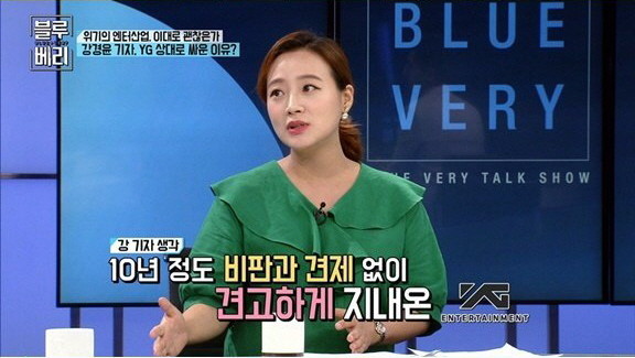 강 기자는 “YG 엔터테인먼트의 독재 경영구조와 소속 연예인들의 허물을 권력으로 덮는 관행 등이 현 악재의 원인”이라고 주장했다. 이어 “현재 양 前 프로듀서 역시 ‘성매매알선혐의’로 입건된 상황이지만 회사에 복귀할 것”이라고 예측하며 구체적인 이유를 설명했다.