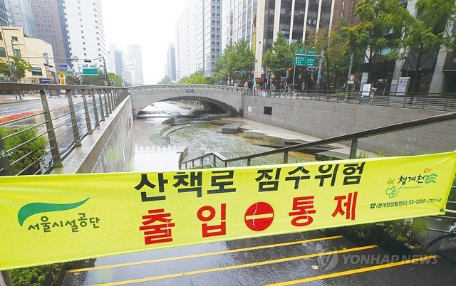 월요일인 29일 전국이 흐리거나 구름이 많은 가운데 중부지방에 아침까지 장맛비가 내릴 것으로 예상되는 가운데 28일 서울 종로구 청계천 산책로 입구에 출입 통제 표시가 설치돼 있는 모습이다. 28~29일 오전 9시까지 예상 강수량은 중부지방(강원영동 제외), 서해5도 50∼100㎜, 제주도 5∼60㎜로 예보됐다.
