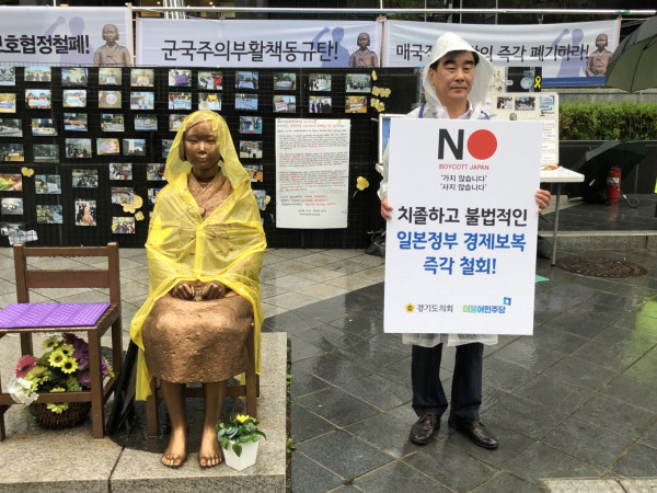 도의회 민주당의 릴레이 1인 시위는 대법원의 강제징용 배상판결에 대한 일본정부의 경제보복 철회 및 한반도 강제병합과 전쟁범죄에 대한 진심어린 사과를 촉구하기 위해 마련됐다.