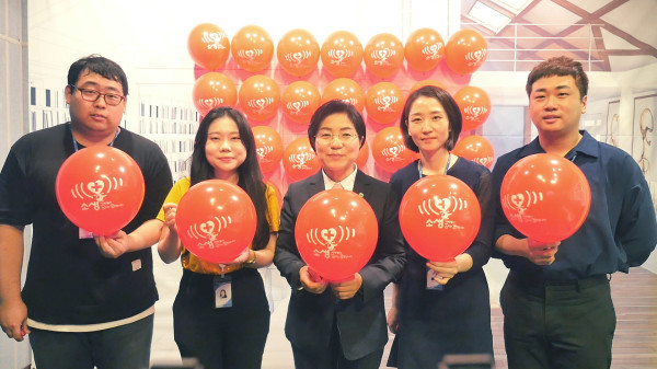 김미경 은평구청장이 최근 국민적 화제 속에서 전개되고 있는 ‘닥터헬기 소생 캠페인’에 동참, 캠페인 관련 문구가 새겨진 풍선을 터트리면서 닥터헬기 운항시 발생하는 소리를 간접 체험하고 구민들에게도 닥터헬기 소리에 대한 너른 이해를 부탁했다. 사진은 풍선을 들고 기념촬영을 하고 있는 김 구청장(가운데)의 모습. (사진제공=은평구청)