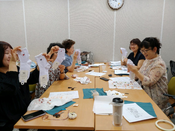 경기 이천시 신둔면 주민자치학습센터는 평생학습 프로그램으로 운영 중인 '자수 클래스 반'에서 최근 장미 자수로 수를 놓은 양말 20켤레를 신둔면주민자치센터에 기부했다. 사진은 기부할 양말을 만들고 있는 자수 클래스반 참가자들의 모습.(사진제공=이천시청)