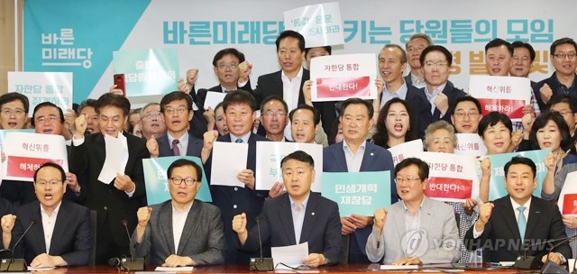 바른미래당 김관영, 문병호 의원과 일부 지역위원장, 당원들이 29일 국회 의원회관에서 ‘바른미래당을 지키는 당원들의 모임’ 회동을 한 뒤 혁신위 해체 및 자유한국당 통합 반대를 요구하는 구호를 외치고 있다.