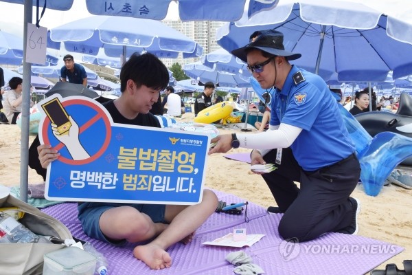 강원지방경찰청이 29일 강릉과 속초 등 동해안 해수욕장에서 피서객을 대상으로 불법 촬영 및 성범죄 예방 폼 보드를 이용해 홍보 활동을 하고 있다. 경찰은 본격 피서철을 맞아 내달 9일까지 불법 촬영 예방을 위한 현장 홍보에 나선다.