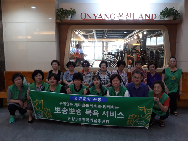 충남 아산시 온양3동 새마을협의회는 29일 온양온천랜드 후원으로 지역내 저소득 홀몸노인들에게 목욕봉사를 했다. 새마을협의회는 격월로 마지막주 월요일 홀몸노인을 대상으로 목욕봉사활동을 하고 있다. 사진은 기념촬영을 하는 모습. (사진제공=아산시청)