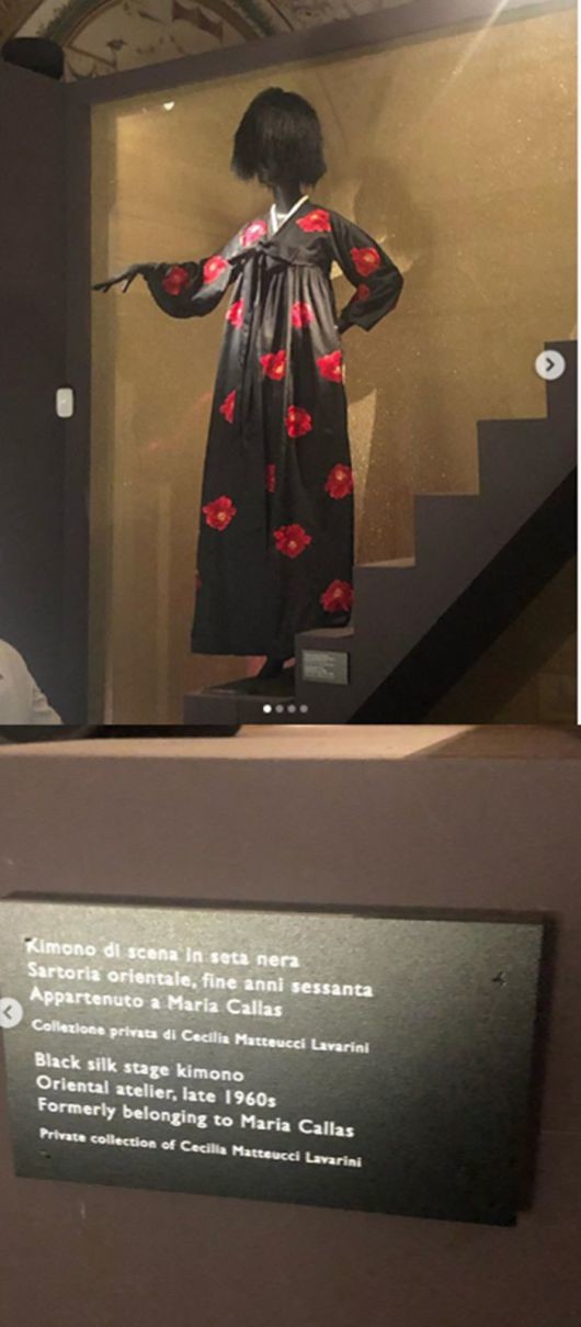 정우영이 지적한 이 전시물 하단의 설명에 따르면 '블랙 실크 '기모노'는 1960년 후반 작품으로, 전설적 디바 마리아 칼라스가 소장하고 있던 한복이다.