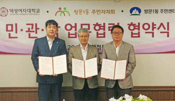 서울 도봉구 쌍문1동 주민센터는 최근 덕성여자대학교 행정동 2층 제1회의실에서 쌍문1동주민자치회, 덕성여자대학교와 함께 ‘마을사업 활성화 및 지역사회 발전을 위한 업무협약’을 체결했다. 사진은 협약 체결 후 기념촬영을 하는 모습. (사진제공=도봉구청)