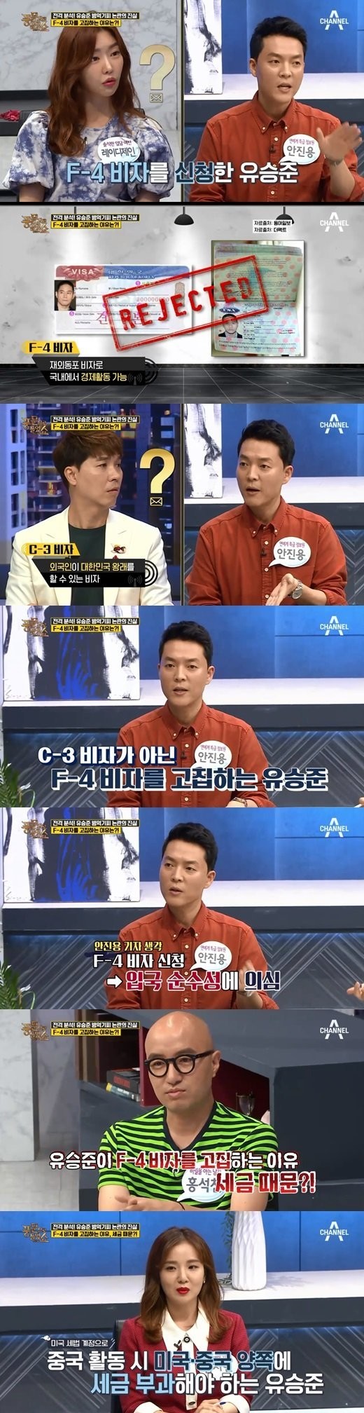 이날 한 출연진은 "유승준이 아이들과 함께 고국에 돌아가고 싶다는 게 이유라고 했는데, 한 가지 이상한 점이 있다. 유승준은 비자 중에서도 F-4 비자를 신청했다. 그게 아니라면 일반적으로 외국인이 한국 왕래를 할 수 있는 C-3 비자를 발급 받아 한국에 올 수 있다"고 말했다.