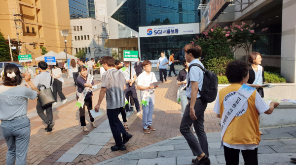 서울 구로구가 한국산업단지공단 서울지역본부와 함께 5일 구로디지털단지 코오롱사이언스밸리 광장에서 ‘안전 점검의 날’ 캠페인을 실시했다. 사진은 참가자들이 폭염·지진 대비 시민행동요령 등에 대해 홍보하고 안내전단지와 홍보물을 배부하고 있는 모습. (사진제공=구로구청)