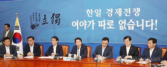 더불어민주당 이인영 원내대표가 6일 오전 국회 원내대표회의실에서 열린 원내대책회의-상임위간사단 연석회의에서 발언하고 있다. 이날 더불어민주당 원내대표회의실에는 ‘한일 경제전쟁 여야가 따로 없습니다!’ 글귀가 적힌 회의장 배경막이 새로 걸렸다.