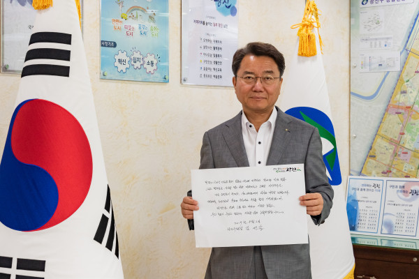 김선갑 서울 광진구청장이 지난 5일 ‘평화의 소녀상 건립 해외 도시 응원 챌린지’에 동참했다. 유덕열 동대문구청장의 지목으로 이번 챌린지에 참여한 김 구청장은 페이스북과 인스타그램을 통해 관련 내용을 인증했다. 사진은 챌린지에 참여한 김 구청장이 자필 메모를 들고 기념촬영을 하는 모습. (사진제공=광진구청)