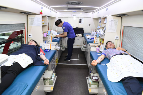 경기 양주시는 7일 시청 보건소 앞에 설치된 이동식 헌혈버스에서 헌혈을 통한 생명나눔과 이웃사랑을 실천하기 위해 대한적십자사 동부혈액원과 함께 ‘사랑의 헌혈운동’을 전개했다. 사진은 헌혈운동에 동참한 시민들이 헌혈을 하고 있는 모습. (사진제공=양주시청)