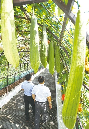 절기상 입추(立秋)를 하루 앞둔 7일 정부세종청사 옥상정원의 넝쿨 터널에 수세미가 주렁주렁 달려있다. 기상청은 입추인 8일에도 전국에 30도가 넘는 무더위가 이어질 것으로 예보했다.
