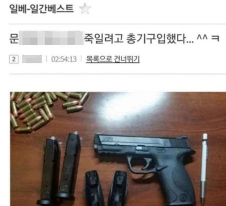 이 작성자는 지난 3일 오전 2시 54분께 일베 게시판에 '문 대통령을 죽이려고 총기를 구입했다'는 제목의 글을 올렸다. 이 글에는 권총과 실탄 여러 발이 찍힌 사진과 문 대통령의 합성 사진 등이 포함됐다.