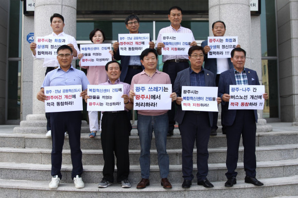 나주시의회 더불어민주당 소속 시의원 12명은 지난 7일 시의회 정문에서 긴급성명서를 내고 “광주광역시는 빛가람 복합혁신센터 건립 방해를 즉각 중단할 것”을 촉구하고 나섰다.