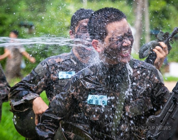 8일 충남 논산 육군훈련소에서 훈련을 마친 훈련병들이 샤워터널을 지나며 더위를 식히고 있다. 훈련소는 무더위에 지친 훈련병들을 위해 각개훈련장과 종합 훈련장 등 4곳에 샤워터널을 설치해 운영하고 있다.